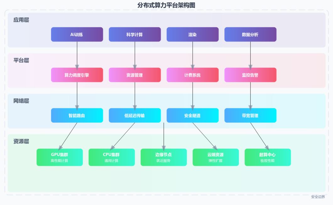 分布式算力平台以资源层为基础,平台层调度管理,网络层保障传输,应用层实现AI与科学计算等高性能服务。